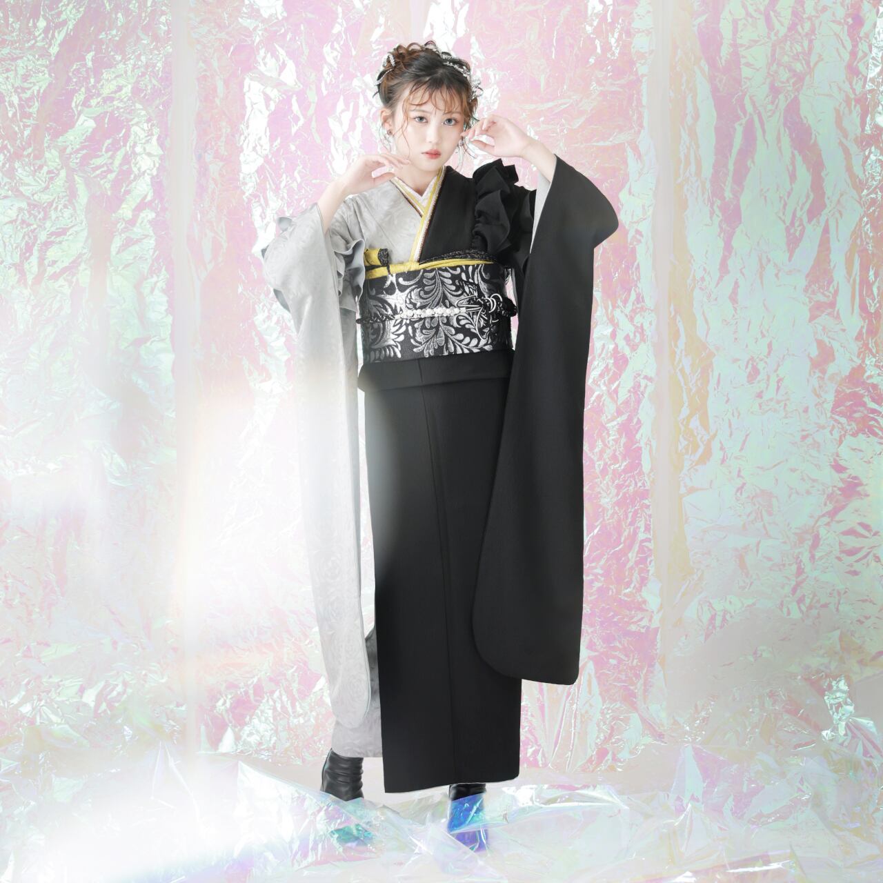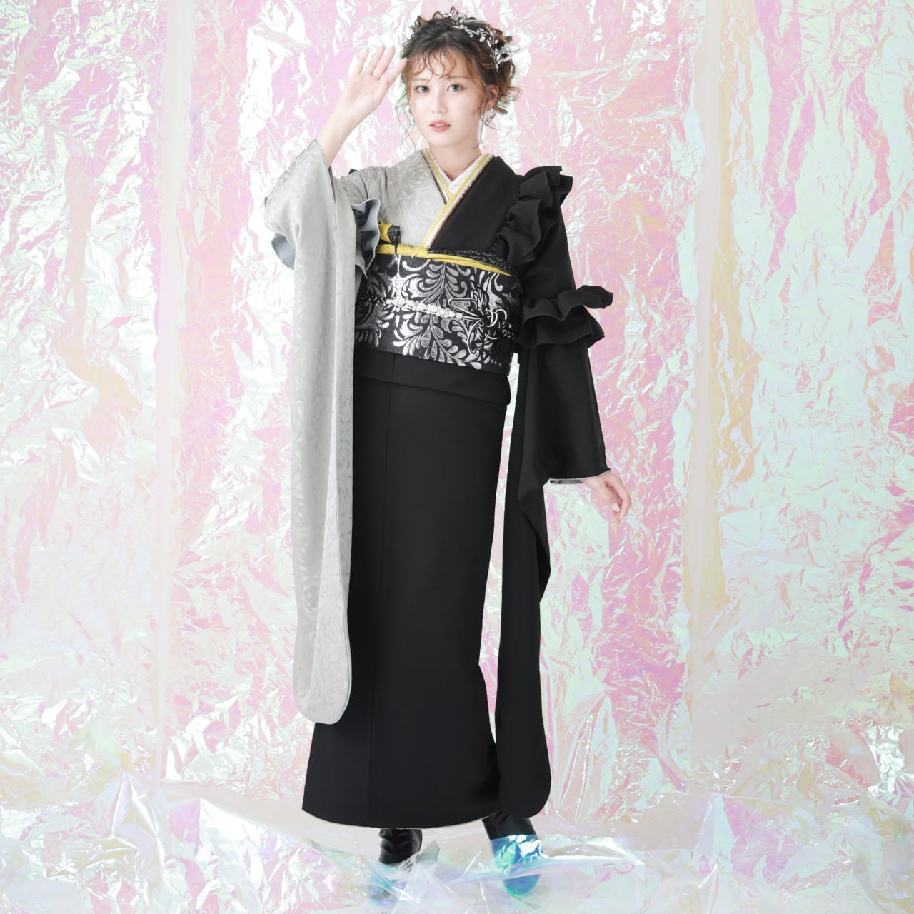 【レンタル】【ご成約済】☆2026年1月成人式☆振袖 結納 結婚式 カリスト フリル グレー 黒 【F3024(27446)】
