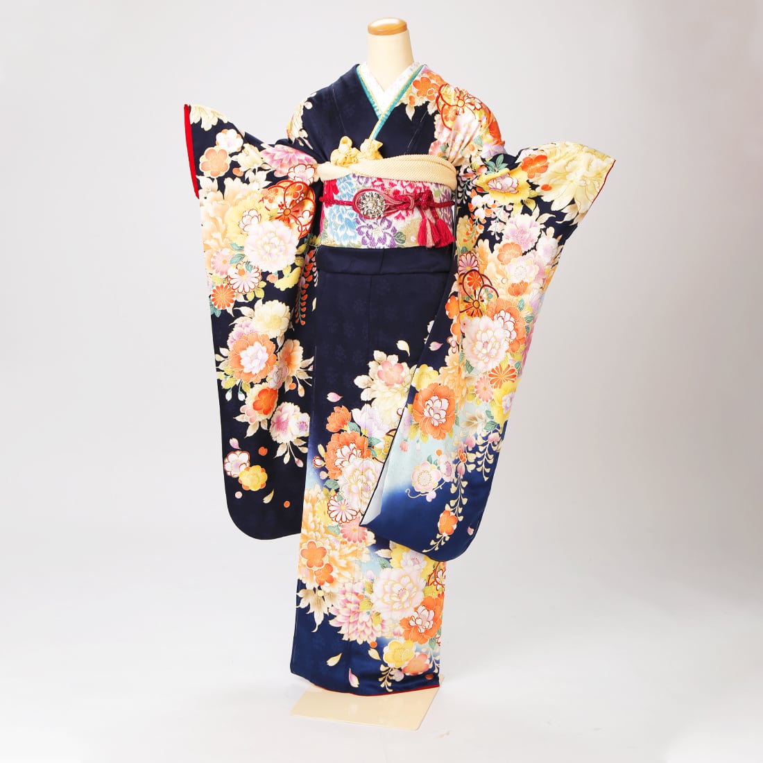 濃紺にオレンジの花が映える、古典的で大人な振袖♪
