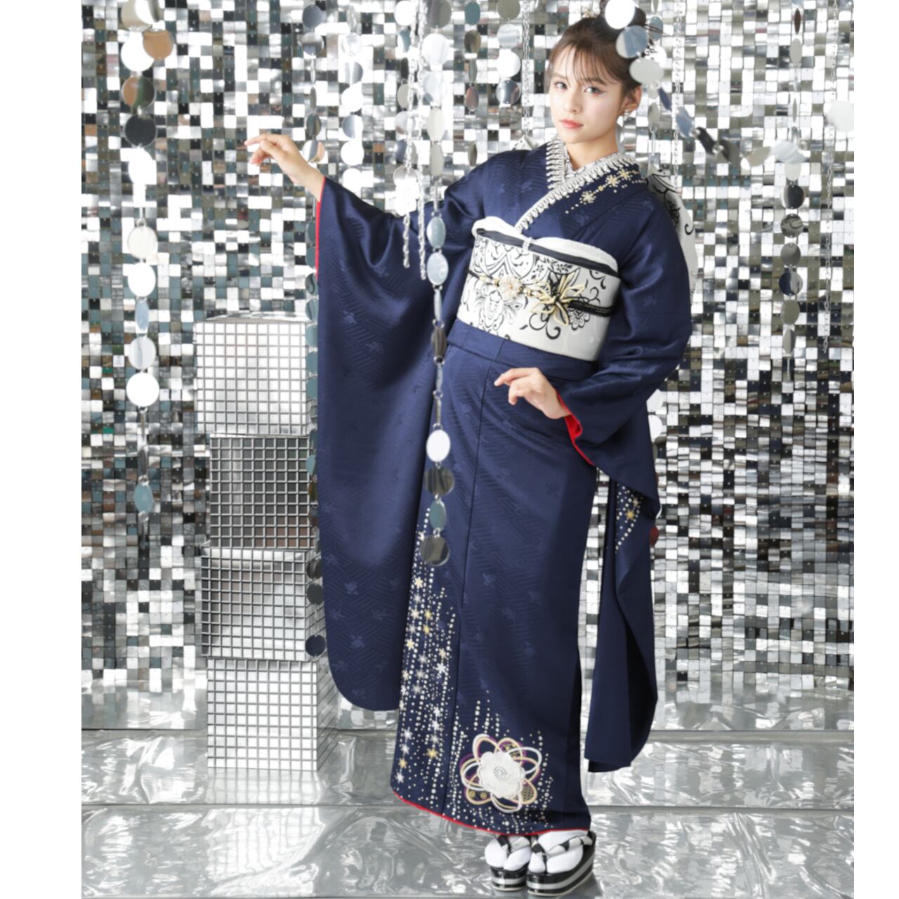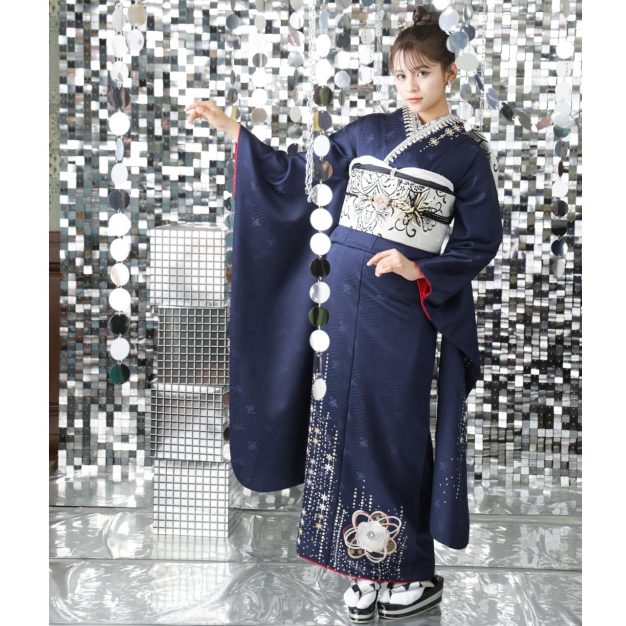 シンプルなネイビーの振袖にきらきら光るストーンが可愛い♪